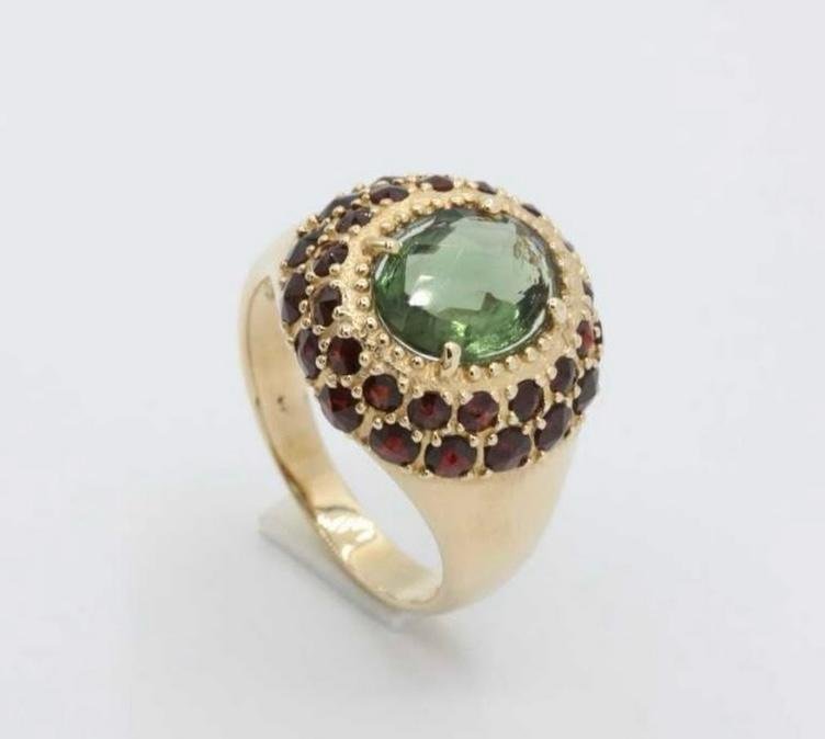 Ring featuring a Moldavite stone and garnet on a classic bohemian Czech design